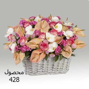 گل های این سبد گل به رنگ های سفید و صورتی است